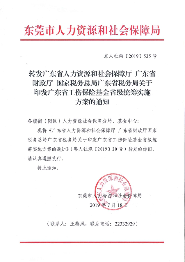 转发广东省人力资源和社会保障厅广东省财政厅国家税务总局广东省税务局关于印发广东省工伤保险基金省级统筹实施方案的通知